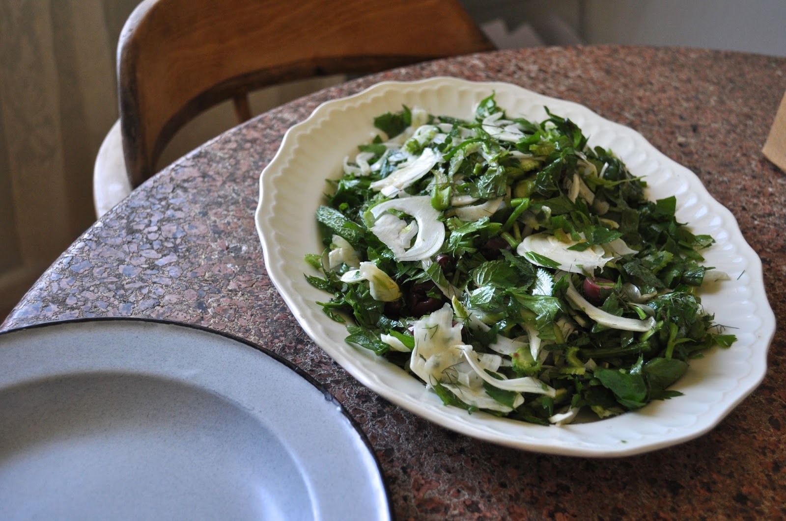 At a market last spring, she made this amazing salad to go with her bacon and egg rolls and found time to the recipe down for me. She chopped lots of celery, fennel, mint, black olives and dressed it with lemon and olive oil. It was so, so good, the kind of thing that makes me hold my bowl very close to my face to speedily hoover up.